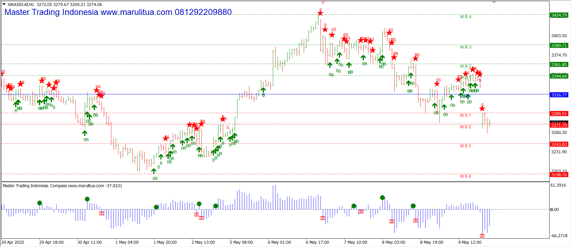 Maruli Signal, sistem indikator Matematika Statistika teknikal otomatis, yang berbasis Fundamental pada MetaTrader 4 (MT4) Indosukses Futures, kembali menunjukkan keunggulannya dalam membaca dinamika pasar secara presisi. Pada grafik H1, sinyal jual yang muncul di area resistance utama disertai indikator khas berupa bintang merah dan panah arah tren, mengindikasikan tekanan bearish yang signifikan. Harga pun menembus level Maruli Support 1 (MS1) dan sempat menyentuh area MS2, mempertegas tekanan jual yang sudah terdeteksi sebelumnya.