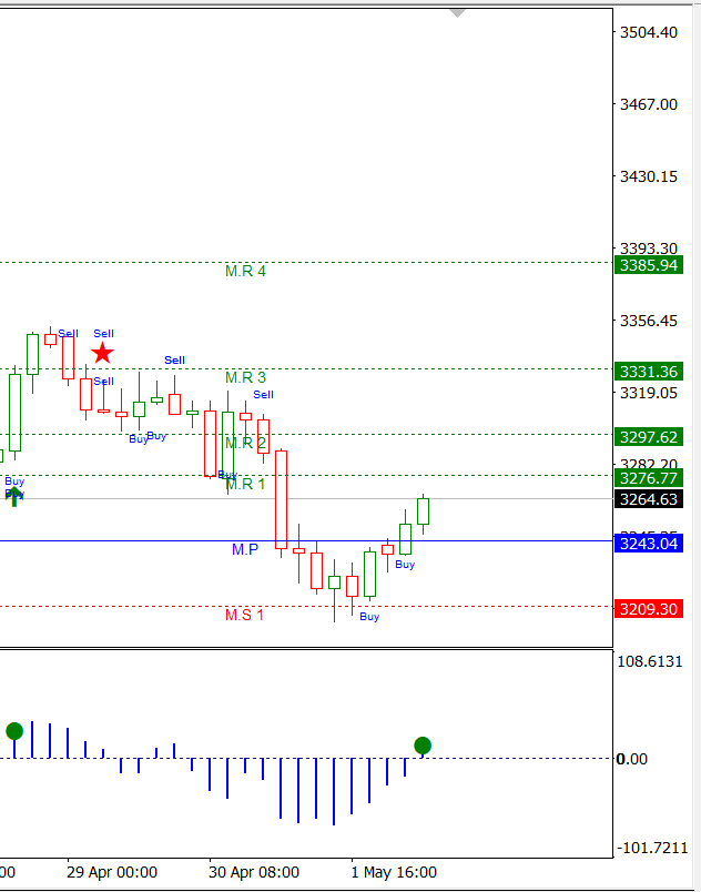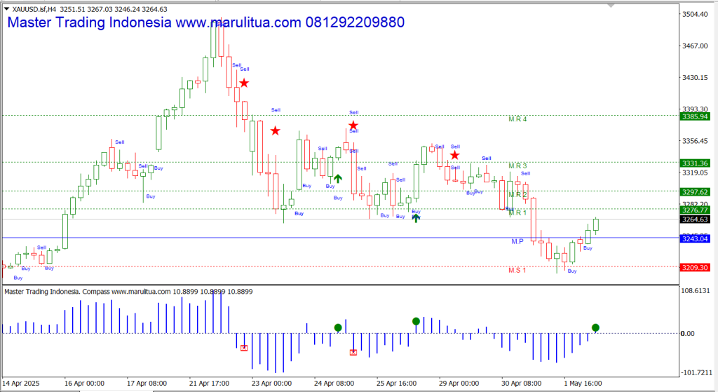 Berdasarkan grafik H4 dari Master Trading Indonesia, indikator Compass mulai menampilkan balon hijau di atas level nol, yang menjadi sinyal awal momentum bullish baru. Selain itu, beberapa sinyal “Buy” juga muncul di sekitar zona support penting, menandakan bahwa pasar mulai mengantisipasi pelemahan data tenaga kerja AS sebagai potensi pendorong kenaikan harga emas.